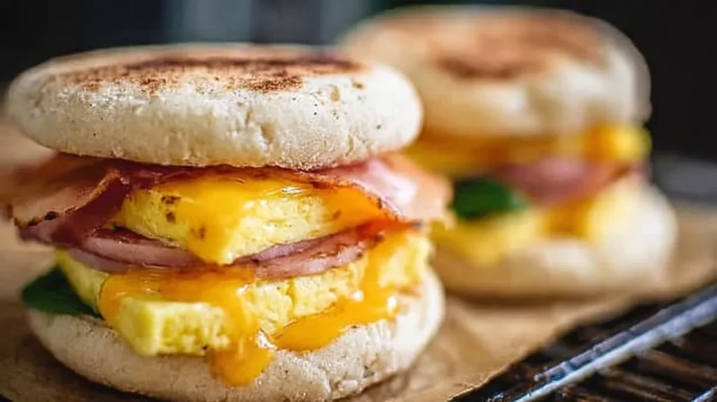 - Assemble the sandwiches by layering a square of egg, a slice of cheese, and your choice of meat between halves of the English muffins.